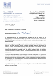Face à la préoccupation croissante de nos concitoyens concernant la fermeture du guichet de la gare de Bischwiller, j’ai adressé un courrier à Monsieur Thibaud Philipps, Vice-Président en charge des transports au sein de la Région Grand Est afin de lui faire part des enjeux de cette décision et des inquiétudes qu’elle suscite.